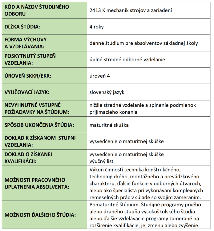 Študijný odbor 2413 K mechanik / mechanička strojov a zariadení je štvorročný študijný odbor pre chlapcov aj dievčatá ukončený maturitnou skúškou a získaním výučného listu.